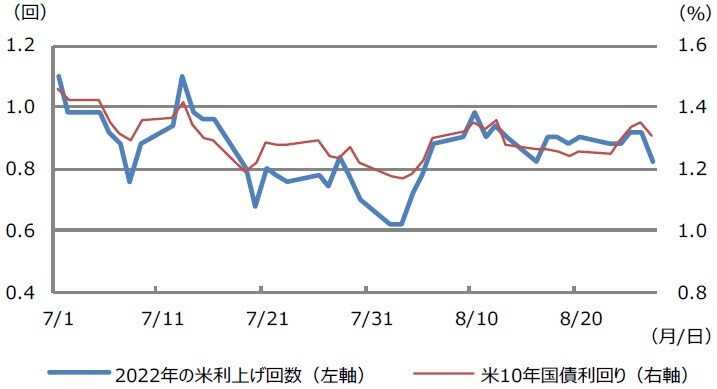 8月27日付レポート『米利上げの織り込みと米長期金利の関係』でお伝えした通り、市場の関心は、すでに利上げ開始時期へ移行したとみられます。8月27日の米国市場の落ち着いた反応は、パウエル発言(図表1)で、利上げはまだ先と確認されたことによるものと思われます。実際、フェデラルファンド(FF)金利先物市場が織り込む2022年通年の利上げ回数はこの日低下し、それに伴い米10年国債利回りも低下しています(図表2)。