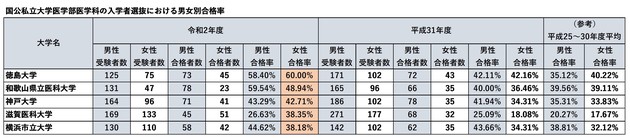 東京医科大学を含む私立30校(東京女子医科大学を除く)において、「平成25~30年度平均」では女性合格率が男性合格率を上回るのが6大学のみであったのに対して、「令和2年度」は約2倍の11校にまで拡大している。ちなみに国公立大学は、「平成25~30年度平均」で女性合格率が男性合格率を勝るのが11校で、「令和2年度」が12校と大きな差はみられない。