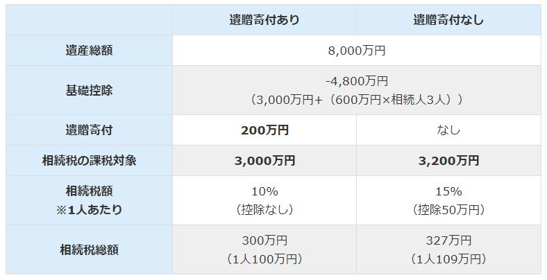 遺贈寄付を200万円しているので財産分与は少なくなりますが、遺贈寄付ありの場合と遺贈寄付なしの場合では、相続税総額に27万円(1人9万円)の差額が生じます。これが遺贈寄付による相続税の節税効果というわけです。