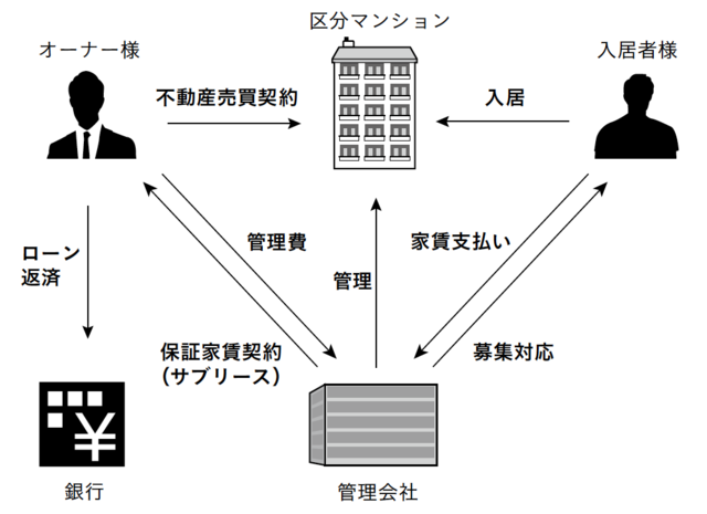 サブリースとは、管理会社がオーナーから物件を借り上げて、第三者に転貸するという仕組みです。その際、管理会社はオーナーへの家賃を毎月保証するという契約を結びます。言葉で説明するとわかりにくいかもしれませんが、要するに下記図表のような状況を作るのです。