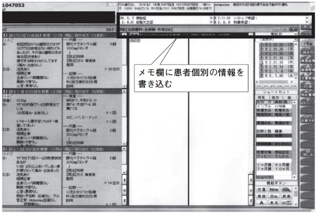 私の院の電子カルテには、雑談のなかから拾ったキーワードを記入するメモ欄があります【写真】。病名や処方についてはコピー&ペーストで事足りますが、こうしたキーワードだけはきちんとメモしましょう。ただし、こうしたメモを残していることを患者に悟られては絶対にいけません。