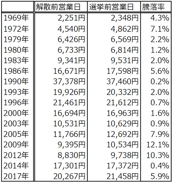 ■1969年以降に実施された衆議院選挙において、解散前営業日から選挙前営業日の日経平均株価は16回すべてで上昇しています。