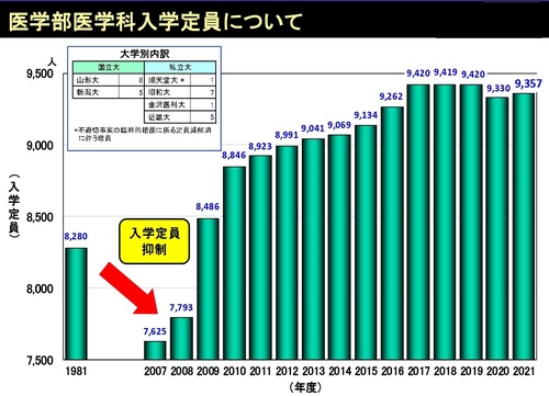 ①医師不足が深刻な10県に10名ずつの暫定的な増員を認めた「新医師確保総合対策」(2008年~2017年度)を皮切りに、②「緊急医師確保対策」(2009年~2017年度)では、医師が必要な地域や診療科に医師を確保・配置するため都府県ごとに5名まで(北海道は15名まで)の暫定的な増員が認められる。2008年には、「早急に医学部定員を過去最大程度まで増員する」という閣議決定がなされ、③「経済財政改革の基本方針2009」(2010年~2019年度)で、都道府県ごとに地域枠で原則10名までの暫定的な増員が許容された。