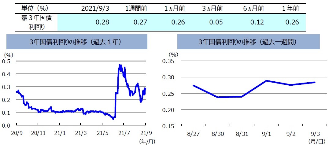 先週の豪州3年国債利回りは、若干上昇しました。前週末のパウエル米連邦準備制度理事会(FRB)議長講演を受け、米国の緩和的な金融政策が当面続くとの見方が強まった他、週末の雇用統計を控え、米国長期金利は一進一退で推移しました。豪州3年国債利回りもつられた動きとなりましたが、豪州の4-6月期GDPデータがやや上振れたこともあり、週間では若干上昇(国債価格は下落)しました。