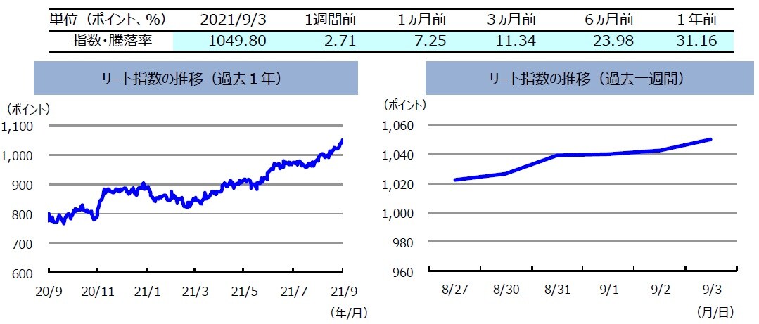 先週の豪州リート指数は、大幅に上昇しました。米国の景気回復への期待や、市場予想を上回る豪州4-6月期GDPなどを背景に豪州株式が上昇しました。一方、豪州長期金利は比較的落ち着いて推移しました。これらを受け、豪州リート市場は大幅に上昇しました。