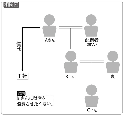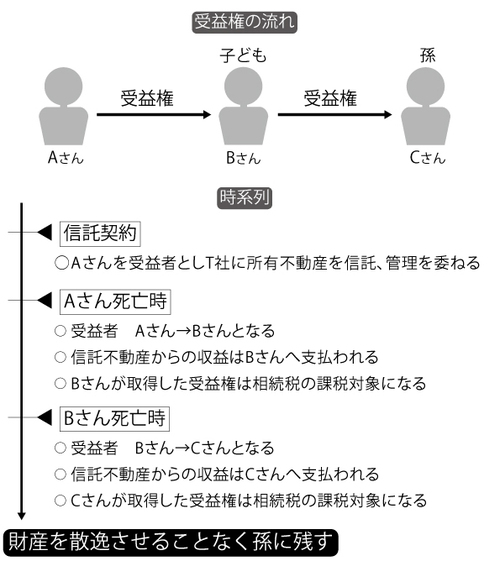 第一受益者であるAさんの死亡後、子どものBさんが第二受益者として受益権を取得、T社が不動産の管理を続け、その賃料収入からBさんにはAさんが生活費として与えると指定した金額だけを渡します。Bさんには財産を処分する権利がないので、財産の散逸を防ぐことができます。なお、Bさんが取得した受益権は相続税の課税対象になります。