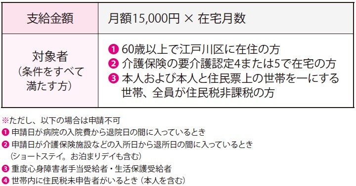 ここでは、東京都江戸川区の介護手当(総称)の例を見てみます([図表4]参照)。なお手当の名称は市区町村によりさまざまで、江戸川区の場合は「熟年者激励手当」という呼称です。