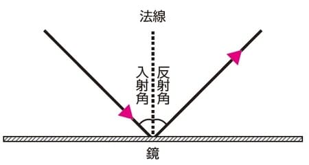 また、鏡に対して垂直な線と、鏡から出ていく光の線とのあいだの角度のことを反射角と言います。