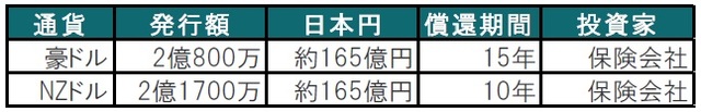 ADBが発行したブルーボンドはオーストラリア(豪)ドル建とニュージーランド(NZ)ドル建の2本建てで構成され、それぞれ別の保険会社が購入しました。