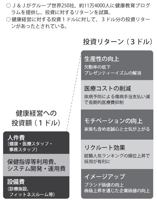 その結果として、同社では、健康経営に対する投資1ドルに対するリターンが3ドルになるとの調査結果を出しているといいます(図表1)。
