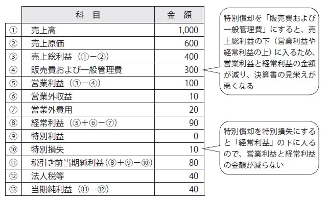 損益計算書の利益は、上から順番に、売上総利益、営業利益、経常利益、税引き前当期純利益、当期純利益の順番に並んでいる。販売費および一般管理費は、売上総利益から引く項目なので、特別償却をここに入れると営業利益が減る。
