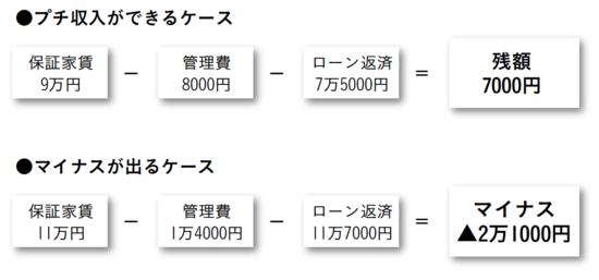 特に新築のきれいな物件などは、物件価格が高いにもかかわらず、サブリースの保証家賃は周辺相場に合わせられていて、月々の返済額と管理費のほうが家賃収入を上回ってしまうケースがよくあります。新築ワンルームマンションなどは割高でこのケースに当てはまりやすいので、注意が必要です。