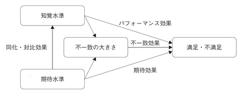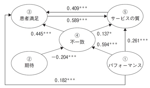 その結果、医療のパフォーマンスの向上は、直接的に患者満足に影響を与えるのと同時に、患者の期待を現実が上回り(正の不一致)、患者満足を高める。医療のパフォーマンスの向上は、医療サービスの質を高める。
