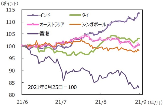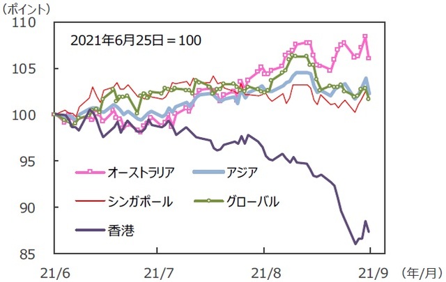 世界の主要株式市場は、高安まちまちとなりました。米国株式市場は、中国の不動産大手、中国恒大集団のデフォルトが懸念され週初に大きく下落しましたが、同社が一部社債の利払いを行ったことや、中国政府の関与が伺われたこと等からリスク回避姿勢が後退し、週後半に大きく反発しました。22日の米連邦公開市場委員会(FOMC)では量的金融緩和の縮小(テーパリング)が近いことが示唆されました。NYダウは週間で0.62%上昇しました。日本株式市場も同様に、中国恒大集団のデフォルト懸念で連休明けに急落して始まりましたが、米国株の上昇を受けて祝日明けの24日に大きく反発しました。日経平均株価は週末に30,000円を回復しましたが、週間では0.82%下落して終了しました。欧州株式市場は、米国株に追随し、反発しました。独DAX指数が0.27%、英FTSE100指数は1.26%の上昇となりました。中国株式市場は、中国恒大集団が社債の利払いを行うと発表したことでリスク回避が一旦後退したものの、警戒感も根強く、週間で下落しました。中国本土市場の上海総合指数は0.02%、香港ハンセン指数は2.92%下落しました。