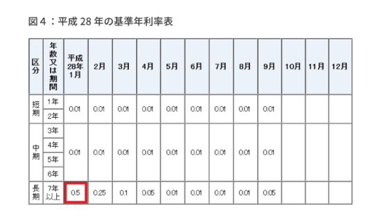 基準年利率表では、相続があった月と定期借地権の残存期間から基準年利率を確認します。相続があったのは平成28年1月で残存期間は40年あるため、この例での基準年利率は、図4のように0.5%となります。