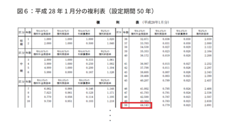 相続があった月の複利表で、当初に定めた定期借地権の設定期間での複利年金現価率を確認します。この例では、当初の設定期間は50年であるため、図6のとおり44.143となります。
