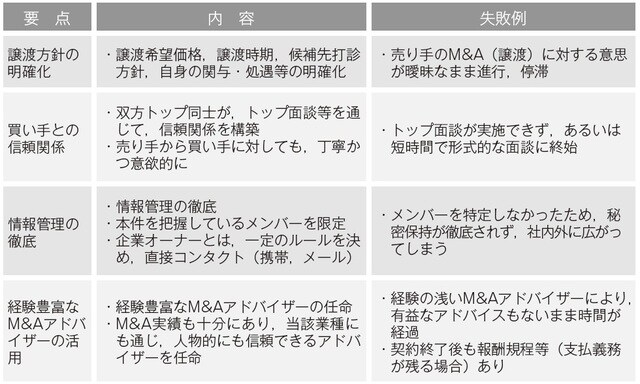 A 売り手(企業オーナー)がM&A(譲渡)を成功させるための要点(ポイント)は、以下のとおりです。また、M&A(譲渡)を失敗してしまう例(失敗例)も考えてみたいと思います(図表1)。