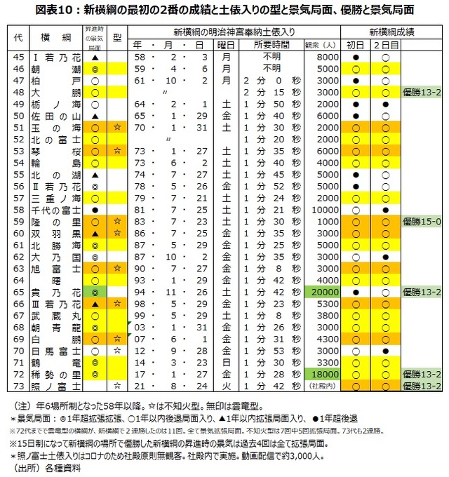 15日制になって新横綱での優勝は、これまでは昭和36年九州場所の第48代横綱・大鵬(13勝2敗)、昭和58年秋場所の第59代横綱・隆の里(全勝)、平成7年初場所の第65代横綱・貴乃花(13勝2敗)、平成29年春場所の第72代横綱・稀勢の里(13勝2敗)の4人で、優勝した場所の景気局面は全て拡張局面であった。重圧を撥ね退け優勝を果たした新横綱から勇気をもらった人も多いだろう。第73代横綱・照ノ富士は令和初の横綱として新横綱の場所で5人目の優勝者となった。景気も拡張局面であることが期待される(図表10)。