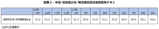 国家統計局の中国製造業PMI21年9月は49.6だった。前月の50.1から0.5ポイント低下し、景気判断の分岐点である50を20年2月以来、1年7ヵ月ぶりに下回った(図表2)。電力不足の他に、国際物流の停滞や半導体不足の影響もみられよう。