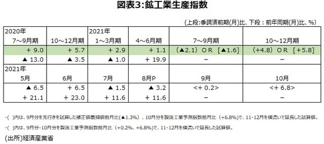 経済産業省の基調判断は7月までの「生産は持ち直している」から、8月で19年1月・2月以来の「生産は足踏みをしている」に引き下げられた。先行きの鉱工業生産指数、9月を先行き試算値最頻値前月比(▲1.3%)で延長したあと、10月を製造工業予測指数前月比(+6.8%)、11月・12月を前月比横這いで延長すると、7~9月期の前期比は▲2.1%の低下に、10~12月期の前期比は+4.8%の上昇になる。7~9月期は5四半期ぶりに、一時的な前期比低下になる可能性が大きい状況だろう(図表3)。