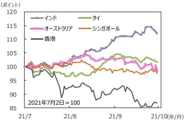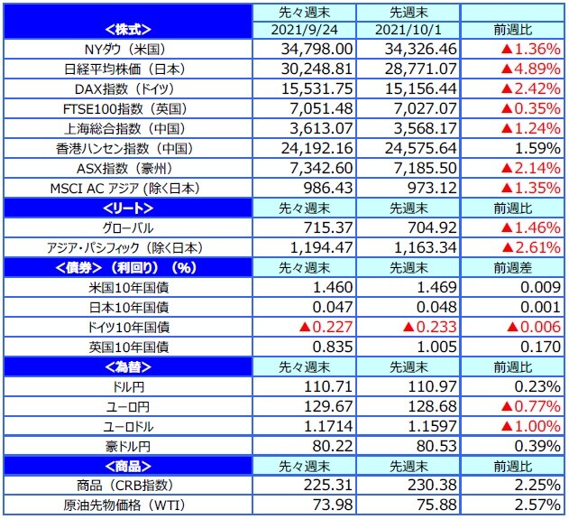 世界の主要株式市場は、概ね下落しました。米国株式市場は、サプライチェーン(供給網)の混乱や、インフレ懸念から長期金利が一時大きく上昇したことに加え、上院共和党が米連邦債務上限引き上げに反対し、政府資金が枯渇して米国債が債務不履行(デフォルト)に陥るリスクなどが嫌気され、下落しました。NYダウは週間で1.36%安となりました。日本株式市場は、米株市場の下落を受けて、大幅安の展開となりました。注目された29日の自民党総裁選では岸田文雄氏の勝利が決定しましたが、市場は日経平均株価が4.89%安となるなど、軟調な展開となりました。欧州株式市場も、米株市場の下落を受けて、軟調な展開となりました。独DAX指数は2.42%安、英FTSE100指数は0.35%安で終了しました。中国株式市場では、中国の電力不足の影響などが懸念されたため、本土市場の上海総合指数は1.24%安となりました。一方、不動産大手のデフォルト懸念がやや後退したとの見方から、香港ハンセン指数は1.59%高と反発しました。