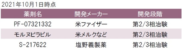 しかし、だからと言って悲観一色になる必要も無いだろう。現在、新型コロナウイルス感染症の経口治療薬が治験の最終段階に入っている(図表3)。