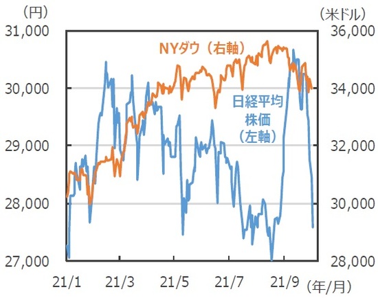 ■日本株下落の背景は、米国の物価と長期金利の上昇、米国の債務上限問題に加え、中国で不良債権問題及び電力規制といった製造ラインに深刻な影響が懸念される事案が重なったことです。国内では自民党総裁選で岸田氏が勝利し、日本の改革期待が後退しました。こうした内外要因から、海外投資家の売りを誘うような展開になったと考えられます。