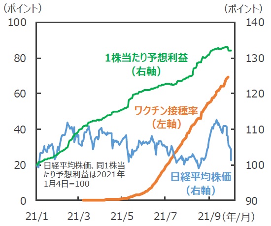 ■この間、ワクチンの接種率は加速し、9月30日には2回接種ベースで16歳以上の人口比で69%に達しました。米国は同68%ですので、接種率ではわずかに米国を上回りました。これまでであれば、ワクチン接種率の向上は、新規感染者数の抑制と相まって、市場のセンチメントを改善する要因とみなされましたが、今回は明らかに期待形成の要因が変化したと言えます。