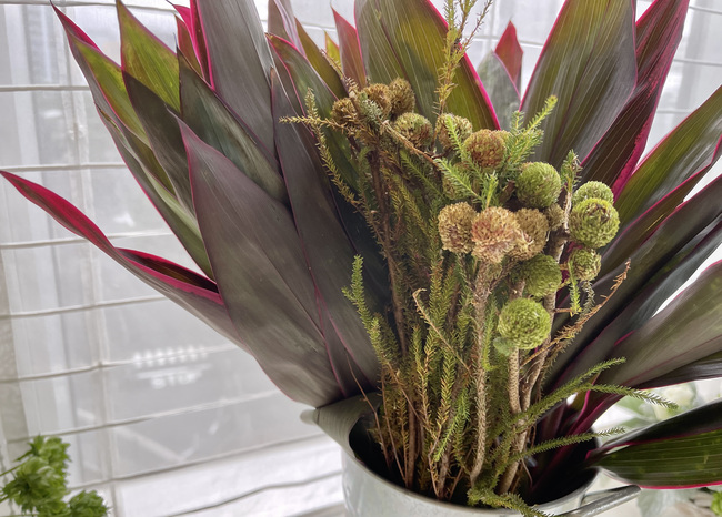 5つ目はドラセナです。大きく丈夫な葉のため、アレンジがしやすく多用されます。今回使ったものは縁取りが赤いですが、全体が緑のものもあります。