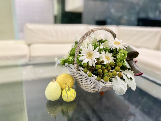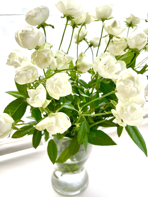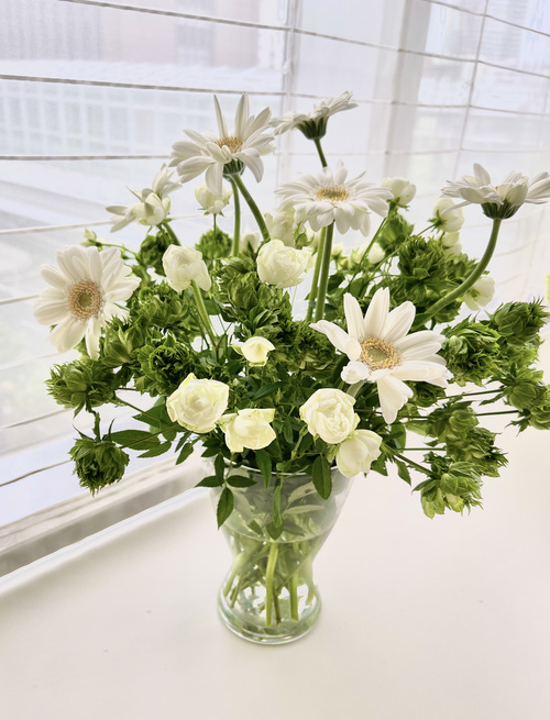白のガーベラの上品さ、高級感を際立出せるためには、周りを緑系の植物で囲んであげるのがおすすめです。ガーベラだけだとカジュアルになりすぎてしまうため、今回はミニバラも一緒に生けました。