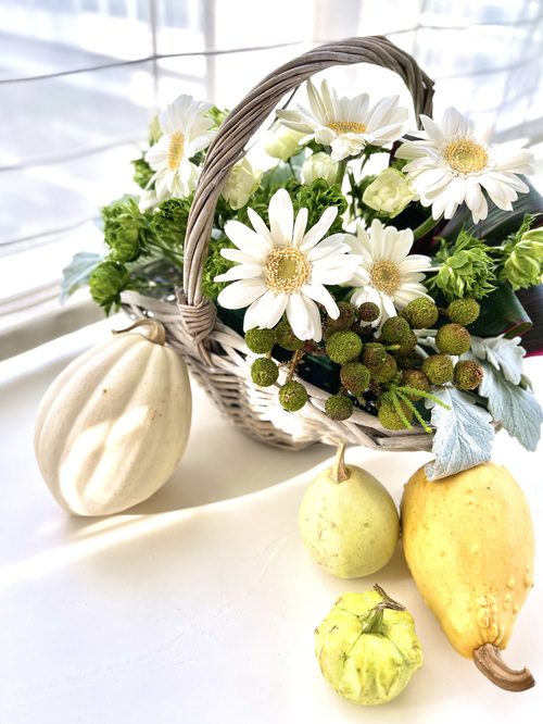 ハロウィン感をだしたいのなら、お花の横にカボチャ(オモチャカボチャ)を何個か置くだけでも十分です。