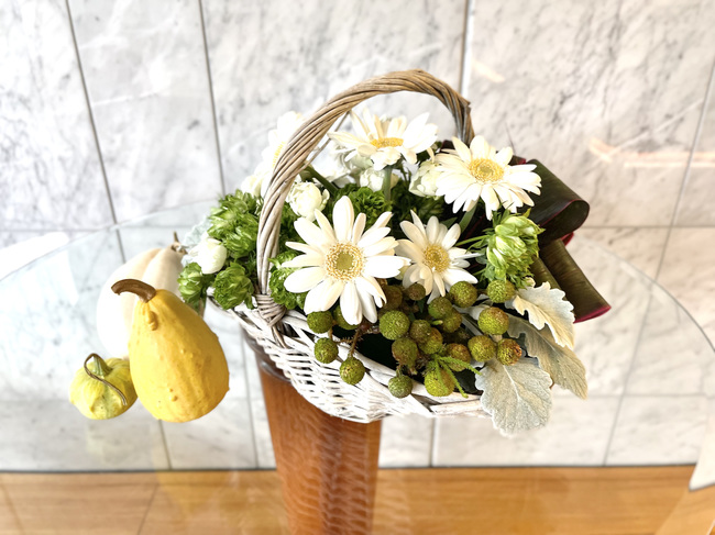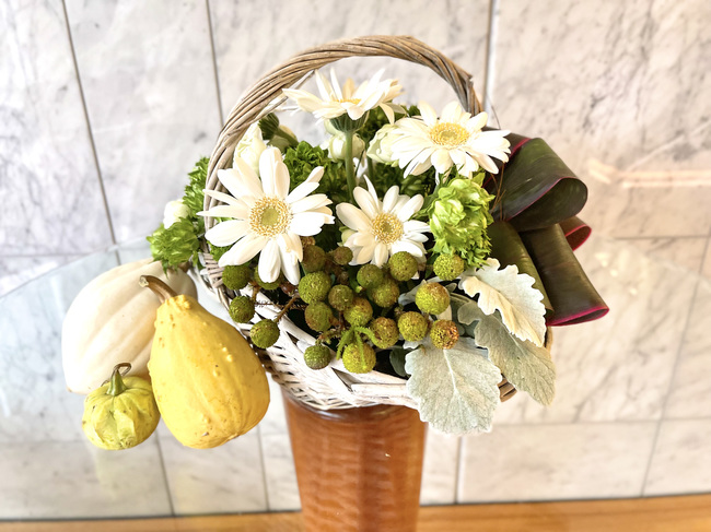 今回のアレンジでは、季節感を取り入れるために大人ハロウィンをテーマにしました。子どもたちに人気のハロウィンを少しでも感じて、明るい気持ちになって欲しいというイメージで生けました。
