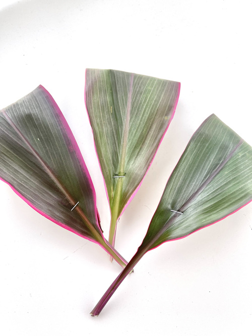 ドラセナの葉は、写真のように折り畳みホッチキスで止めて使うことも多いです。この状態でも長持ちします。