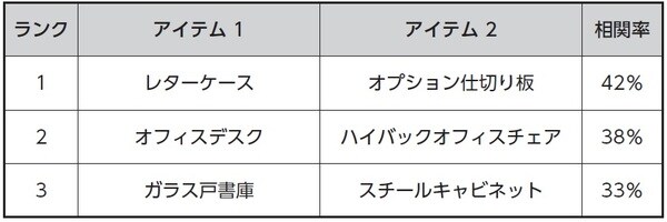 その結果、レターケースとオプション仕切り板の組み合わせがトップで42%の相関率でした。レターケースを購入するお客さまのうち42%はオプション仕切り板も同時に購入する傾向にあることがこのデータで分かります。