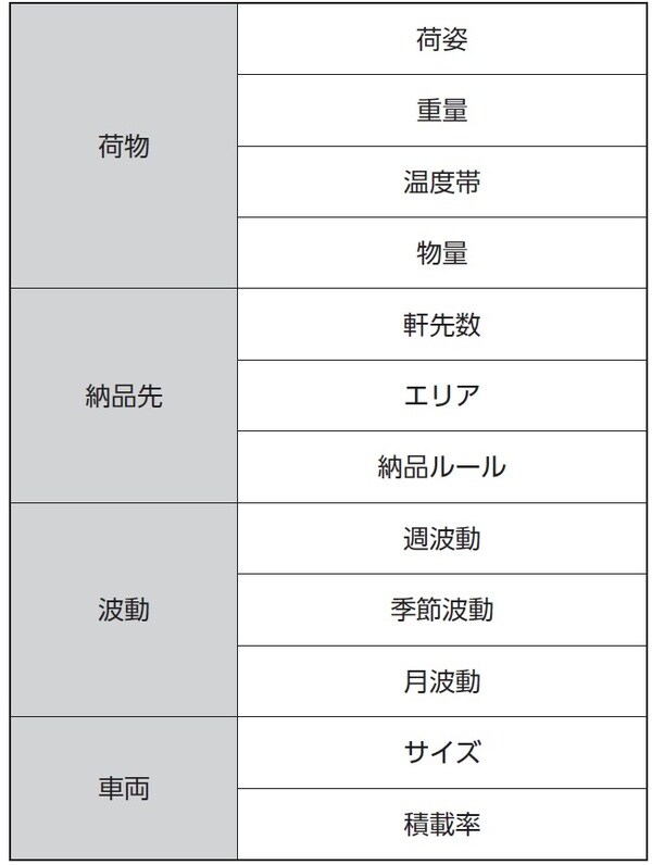 例えば下記の図表のように荷物、納品先、波動、車両については最低限情報を整理して、相手と情報交換をすることも有効です。