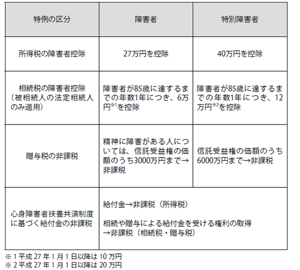 つまり、特別障害者である子どもの生活を支援するために、税金を特別に控除するものである以上、対象となる子ども以外がこの信託から収益を受け取ったり、譲渡、担保になったりしないことを明確にしておく必要があるというわけです。なお、この障害者非課税信託の制度の他に、税法上障害者に対して定められている特例を図表にまとめましたので参考にしてください。
