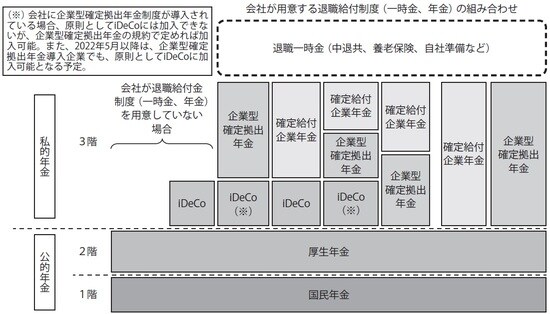会社員の3階部分は、大きく「企業年金」と「個人型確定拠出年金(iDeCo)」とにわかれます。そして、企業年金はさらに、「企業型確定拠出年金」や、厚生年金基金、確定給付企業年金などの制度があります。