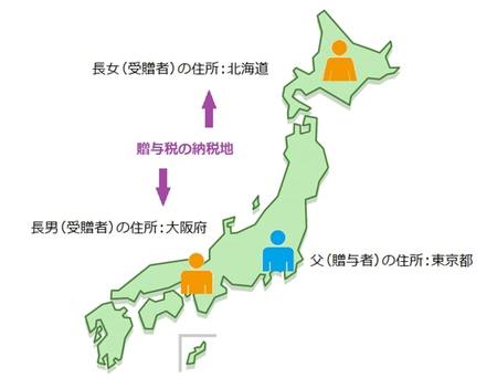 【例】父は長男と長女に現金を贈与した。父は東京都に住んでいて、長男は大阪府に、長女は北海道に住んでいる。