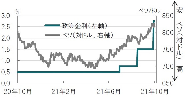 チリ中央銀行は2021年10月13日の政策決定会合で政策金利を1.25%引き上げ、2.75%としました(図表1参照)。今回の利上げ幅は8月会合での0.75%、市場予想の1%を上回りました。