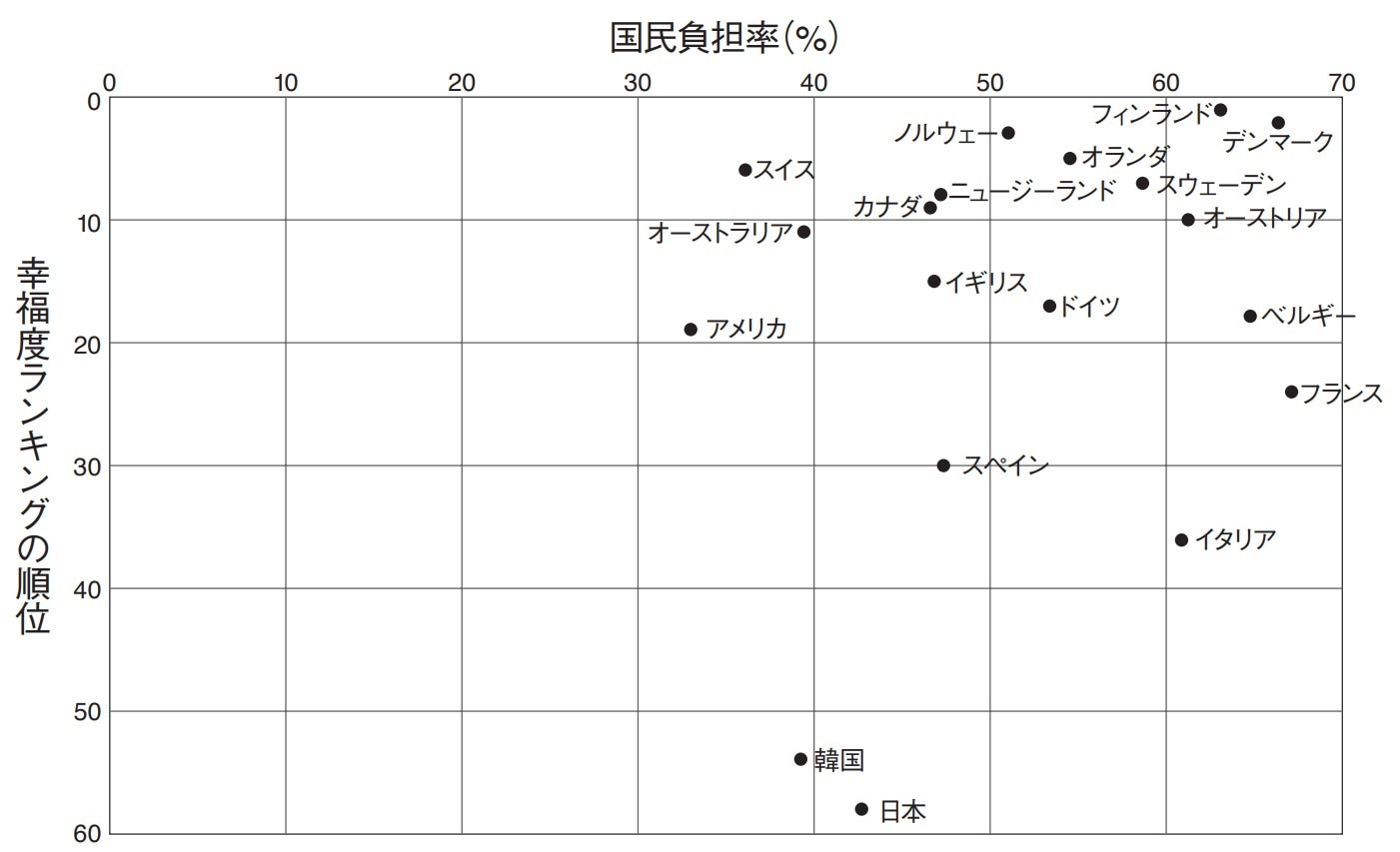 【図2】を見てください。これは横軸に負担率を、縦軸に世界価値観調査の「幸福度ランキングの順位」をとって各国をプロットしたものです。