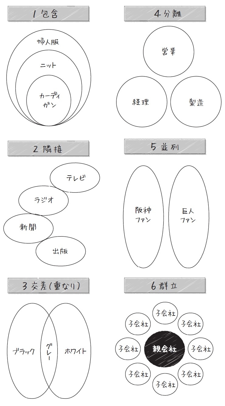 大きなマルが小さなマルを含む構造の「包含」、隣り合う「隣接」、重なり合う「交差」、それぞれ独立した関係を表す「分離」、対比を示す「並列」、親会社と子会社の関係のような「群立」など、さまざまなパターンで構造が表現できます。