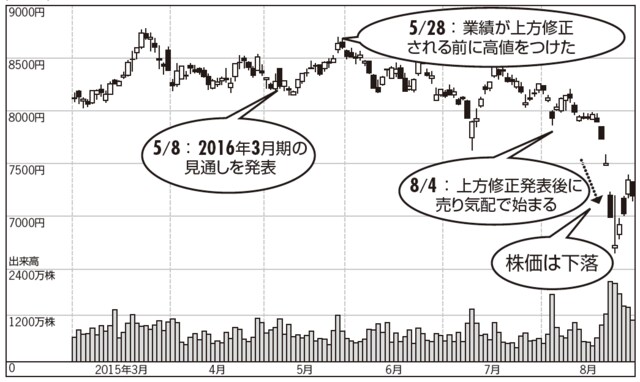 もちろん業績そのものの見方についての判断もあると思われますが、ここで注目すべきポイントは、最高益を更新するだろうとみられていたなかで売上高の上方修正の発表を契機に、いわゆる好材料が出尽くしてそこから下落が始まったわけではなく、業績発表の2カ月以上前の5月28日に高値をつけてから株価が頭打ちとなり、徐々に下落基調になってきているところで、損失拡大を嫌った投資家の売り注文が大量に出て株価が大きく値下がりした点にあります。