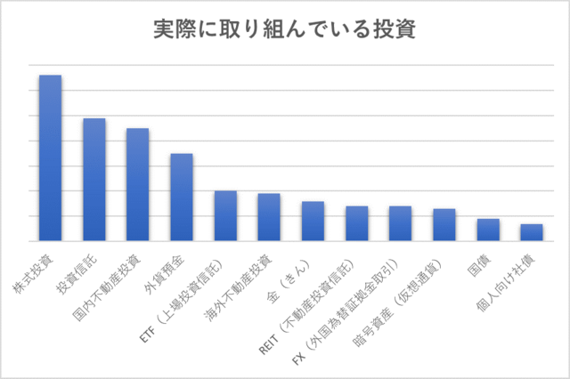 投資信託は実際に取り組んでいる投資でも上位に入っているので、取り組んでいる人といない人で、二極化されていることがわかります。