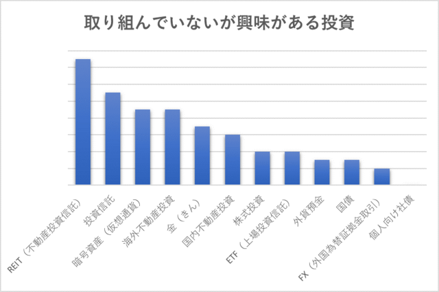 続いて、興味はあるがまだ取り組んでいない投資について見ていきます。 アンケート結果によると、一番多かった回答は「REIT(不動産投資信託)」、次いで「投資信託」、「暗号資産(仮想通貨)」となっています。