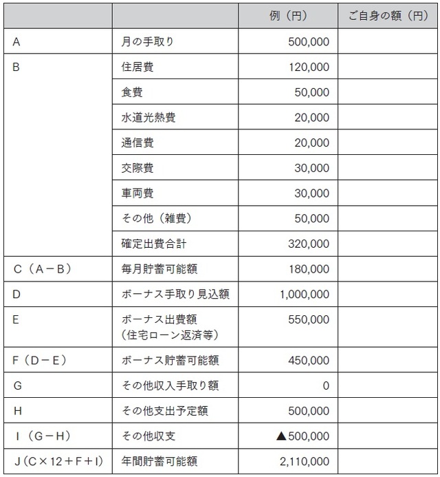 年間いくら手元に現金を貯められるのかすでに余裕資金1000万円がある人はいいですが、これから貯めようという人は具体的な計画が不可欠です。サンプルの図表を用意しました。ワーク形式で実際に計算してみましょう。