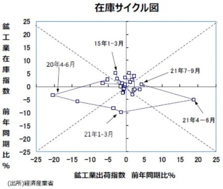 ●鉱工業全体の在庫循環の動きをチェックするために、縦軸に鉱工業在庫指数・前年比、横軸に鉱工業出荷指数・前年比をとった在庫サイクル図をつくると、20年7~9月期までは「在庫調整局面」の状態にあったが、20年10~12月期、21年1~3月期では「意図せざる在庫減局面」になっていた。4~6月期では在庫の前年同期比▲5.0%、出荷が前年の反動もあり、前年同期比+18.8%と2ケタの伸び率になり、「在庫積み増し局面」に入った。7~9月期では在庫が前年同期比+0.8%、出荷が前年同月比+4.2%の伸び率になり、引き続き「在庫積み増し局面」となっている。
