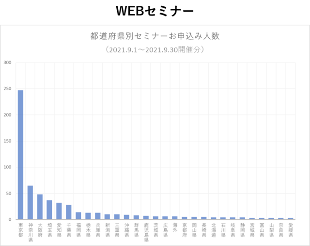 「WEBセミナー」に切り替わってからは、総じてお申込みが増えていることもありますが、福岡県や三重県、沖縄県といった日本全国、さらに海外からのお申込みが増え、1セミナーあたりのお申込者数も大幅に増えました。