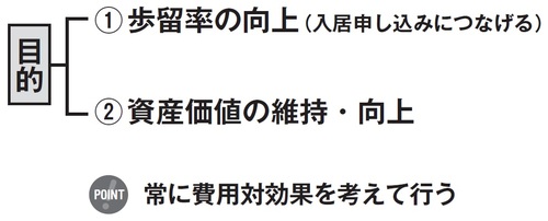リフォームはアパート経営における支出の大きな位置を占めます。この支出をどのようにコントロールするかが、アパート事業の成否を決めることにもなります。リフォームを行うに当たって、すべての基本となる考え方が、費用対効果の視点ですが、そもそもリフォームを行う目的は次の2点に集約されます。
