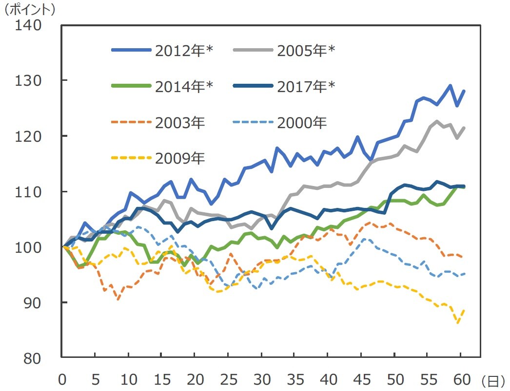 ■2000年以降行われた衆議院選挙は今回が8回目ですが、過去7回の衆議院選挙で自民党が単独で絶対安定多数となったのは4回あります。衆議院選挙の前営業日終値を100として、60営業日までを見ると、100を超えている4回はすべて自民党が絶対安定多数となった局面です。外部環境にもよりますが、政策に対する期待は続くと見られ、年内の日本株式市場は堅調に推移する可能性が高いと思われます。