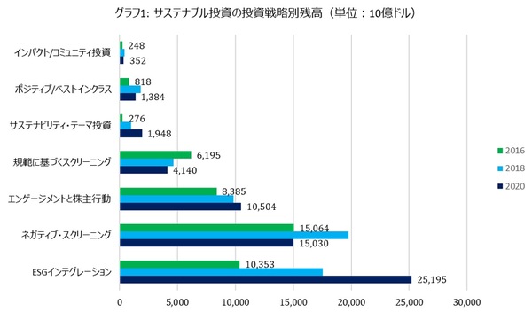グラフ1では2016年からの残高推移を示したが、この間、「ESGインテグレーション」が大きく残高を増加させた一方、「ネガティブ・スクリーニング」は2018年対比で減少している。